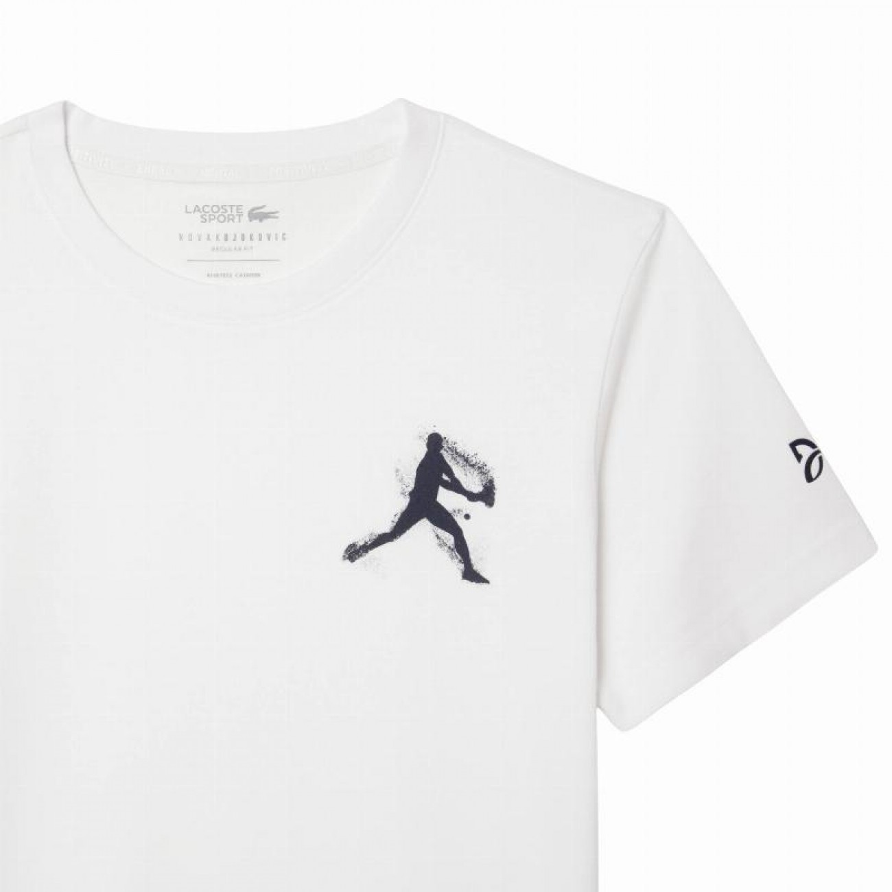 Le design se distingue par son imprimé exclusif de Novak Djokovic en action sur la poitrine, à côté du logo du joueur sur la manche gauche, et le crocodile en silicone Lacoste classique sur la taille.