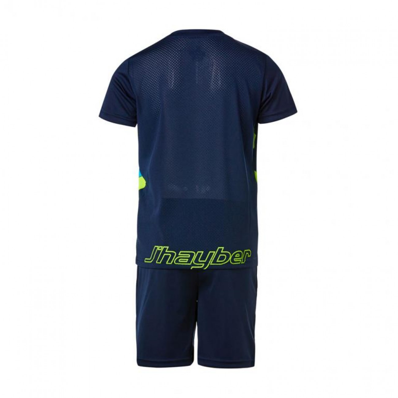 Camiseta deportiva para nino en color marino con detalles lima, fabricada en tejido resistente y ligero.